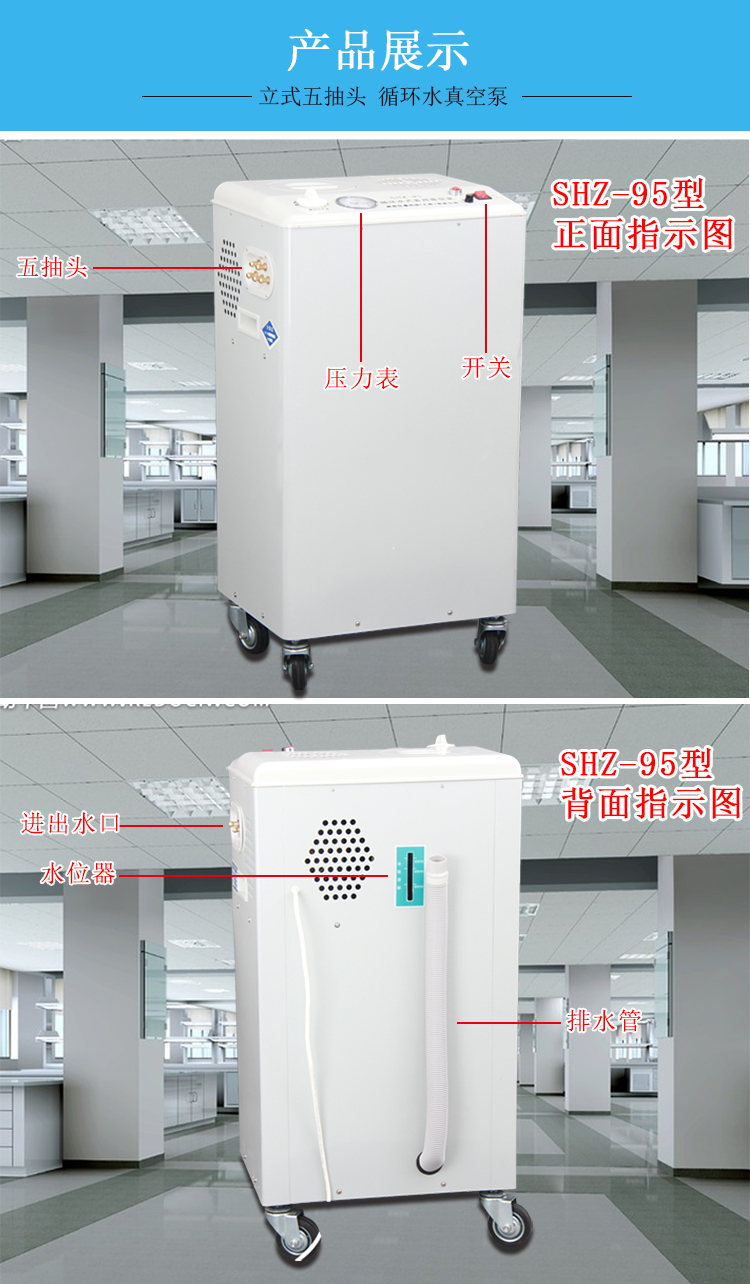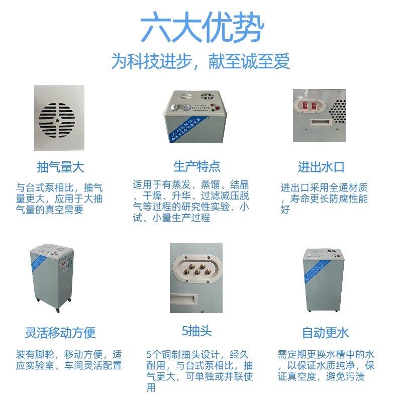 循環水真空泵是大功率多頭抽氣的一種新型循環水式多用真空泵,本機設計內外循環水,可以五頭同時抽氣,具有不用油、功率大、噪音低、方便靈活,節水省電等優點,一機多用。