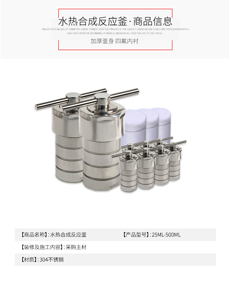 現有水熱合成反應釜型號:5ml、25ml、50ml、100ml、150ml、200ml、250ml、300ml、400ml、500ml、1000m,耐溫度200℃,耐壓力為3MPa。非標型號可以定做。水熱合成反應釜采用無磁性0Cr18Ni9Ti不銹鋼精加工而成,內有聚四氟乙烯襯套,雙層護理,可耐酸,堿等。